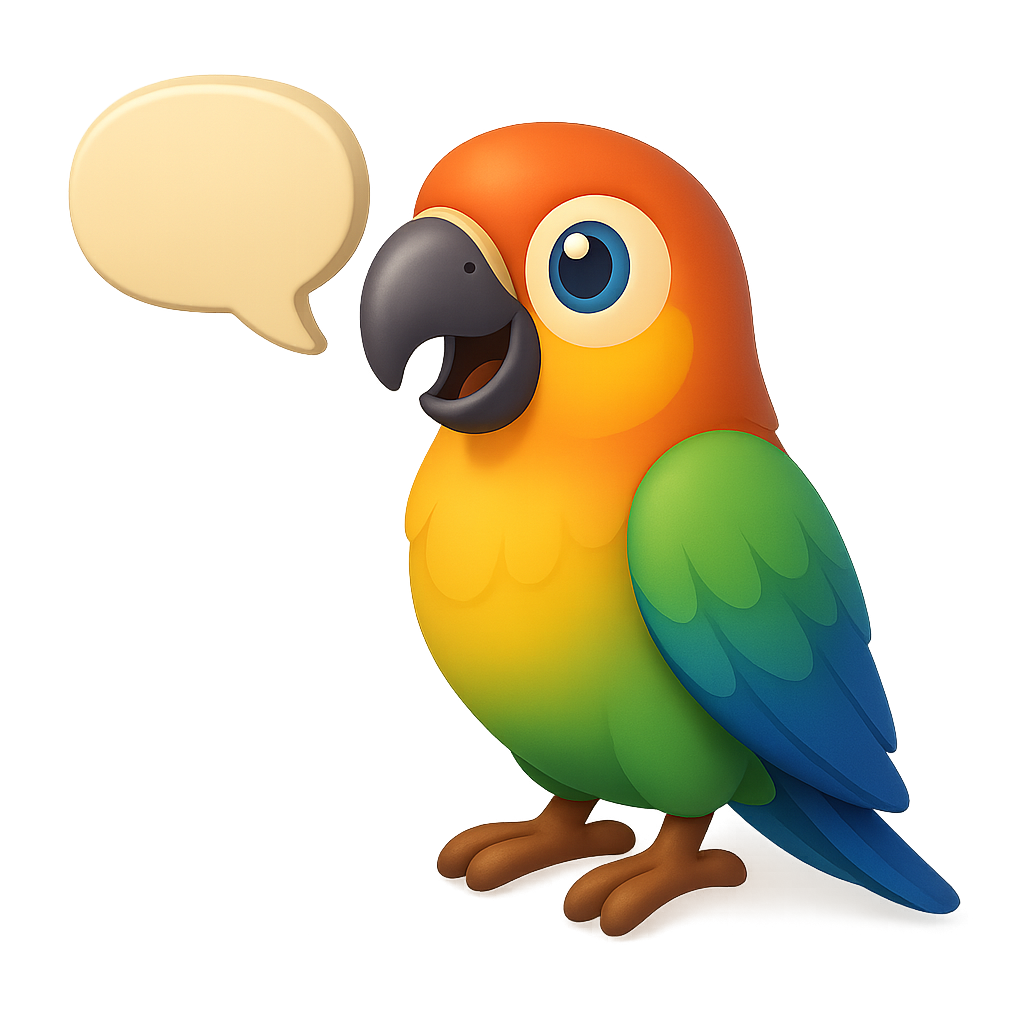 A lively 3D parrot icon featuring vibrant colors and a friendly expression. The parrot is depicted in a three-quarter view with a speech bubble, enhancing its playful nature.