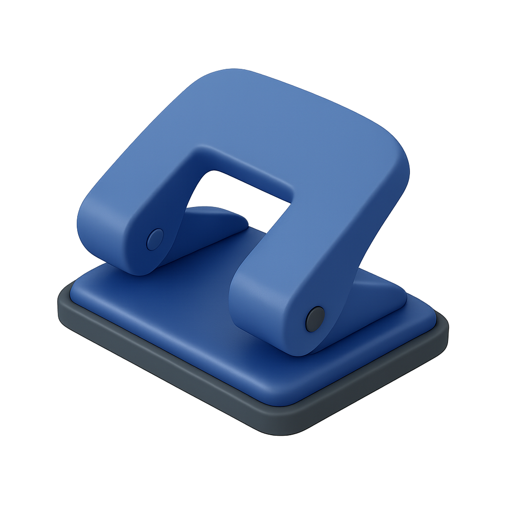 A stylized 3D icon of a hole punch for paper, presented in a three-quarter view with a smooth, volumetric design and transparent background.