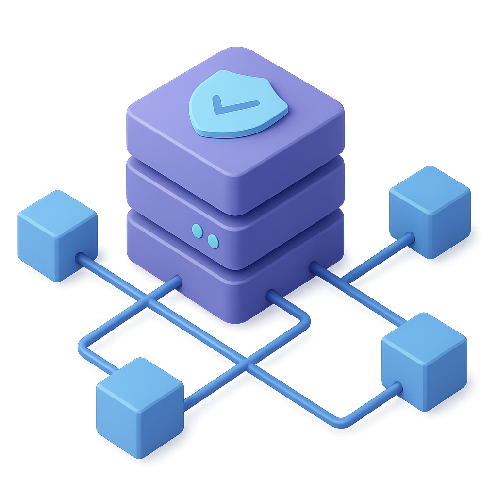 A visually striking 3D icon representing a mesh network, featuring a stack of purple data blocks, a shield symbol, and blue connections, all set against a sleek background.