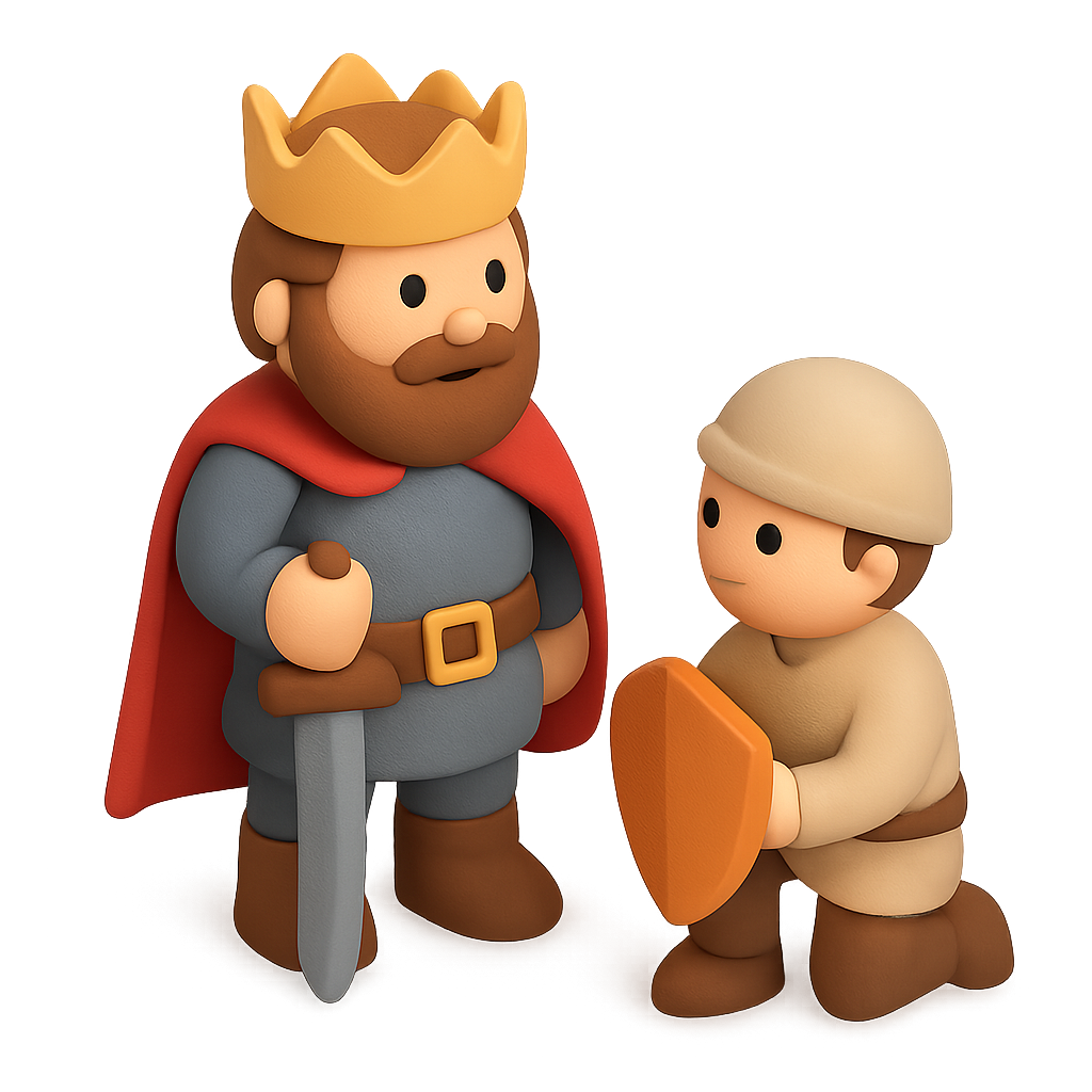 /Collection: /by davooda/Type: PNG/A 3D illustration featuring a feudal lord with a crown and sword, standing beside a vassal holding a shield. The characters are designed with a volumetric, isometric style, set against a soft, blurred background.