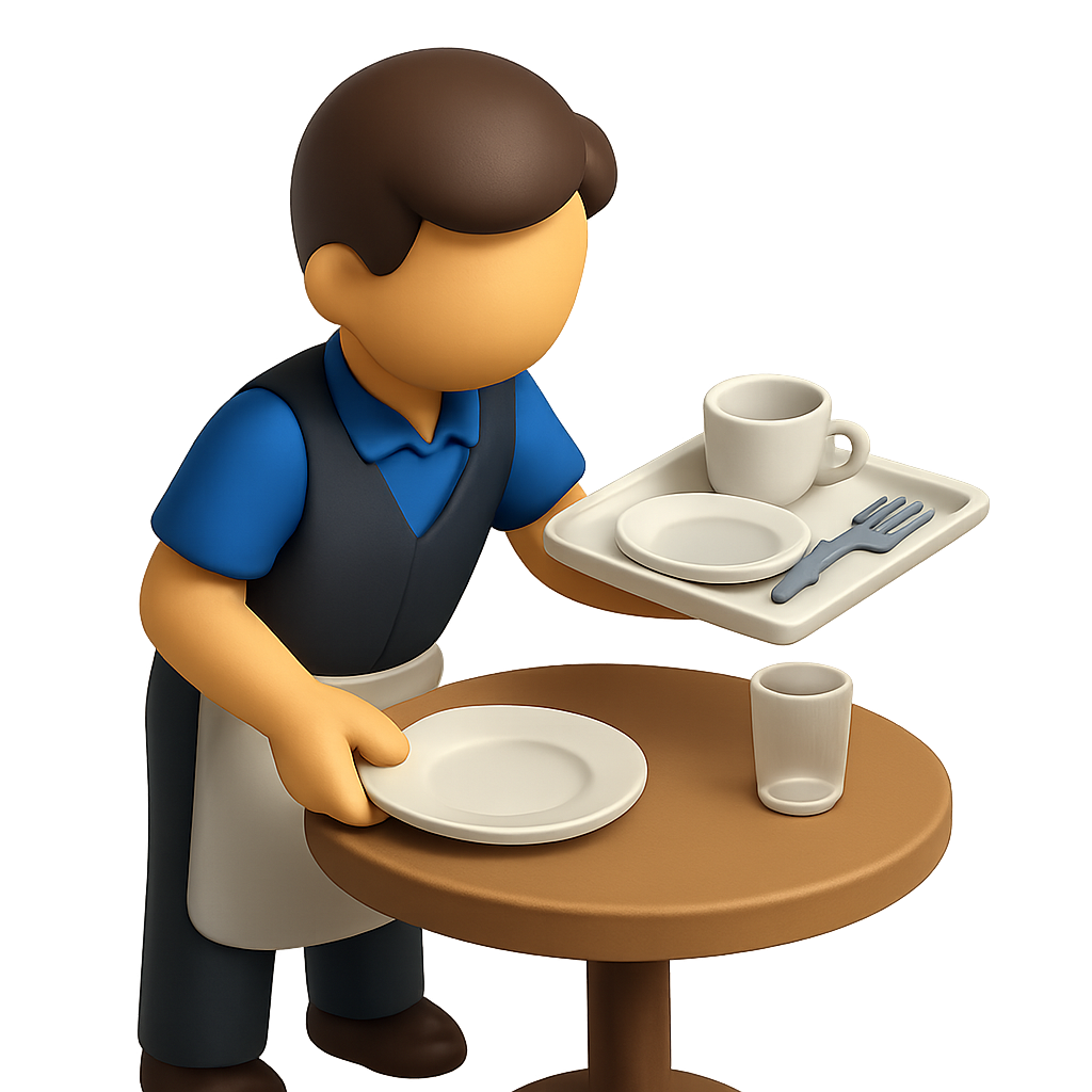 /Collection: /by davooda/Type: PNG/A stylized 3D icon depicting a busboy clearing a table. The character holds a tray with dishes and utensils, showcasing a simple yet effective volumetric design.