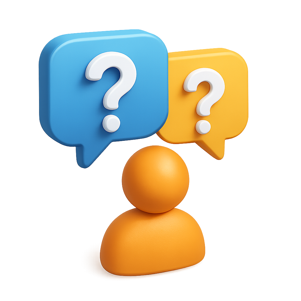 /Collection: /by davooda/Type: PNG/A visually appealing 3D representation of two speech bubbles, one blue and one yellow, each containing a question mark, set against a soft gradient background. A simplistic orange user silhouette is positioned below the bubbles, enhancing the interactive feel.