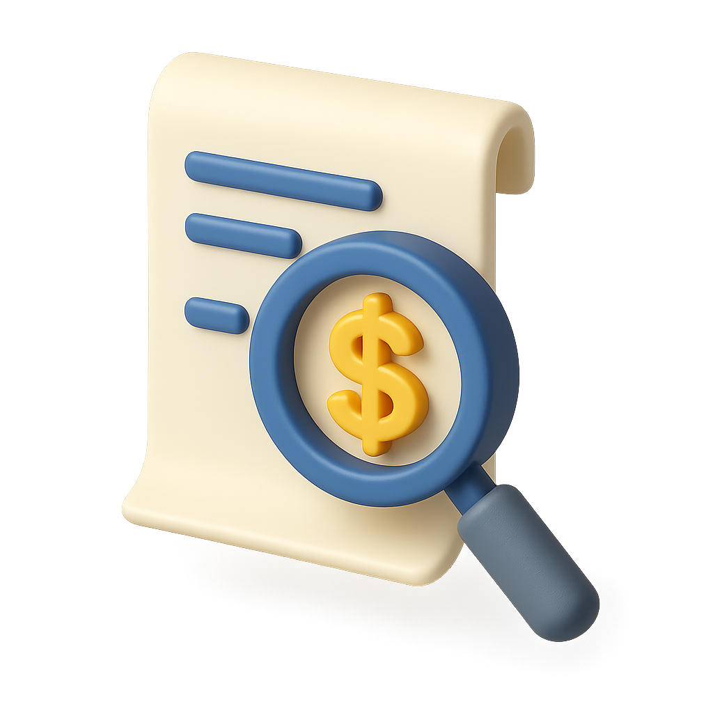3D Icon of Magnifying Glass Over Document with Dollar Sign