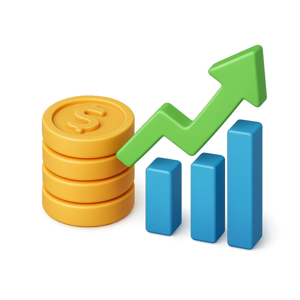 /Collection: /by davooda/Type: PNG/A visually appealing 3D icon featuring stacked gold coins and a rising green arrow over blue bar graphs, symbolizing financial growth and increasing profits.