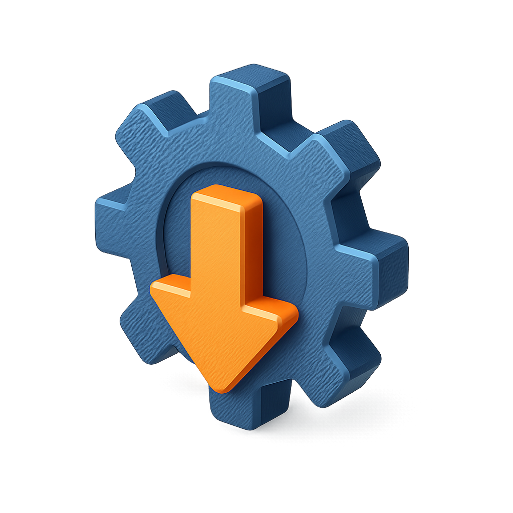 /Collection: /by davooda/Type: PNG/A stylized 3D gear icon featuring a prominent downward arrow in vibrant orange, set against a subtle gradient background. The gear exhibits a three-quarter isometric view.