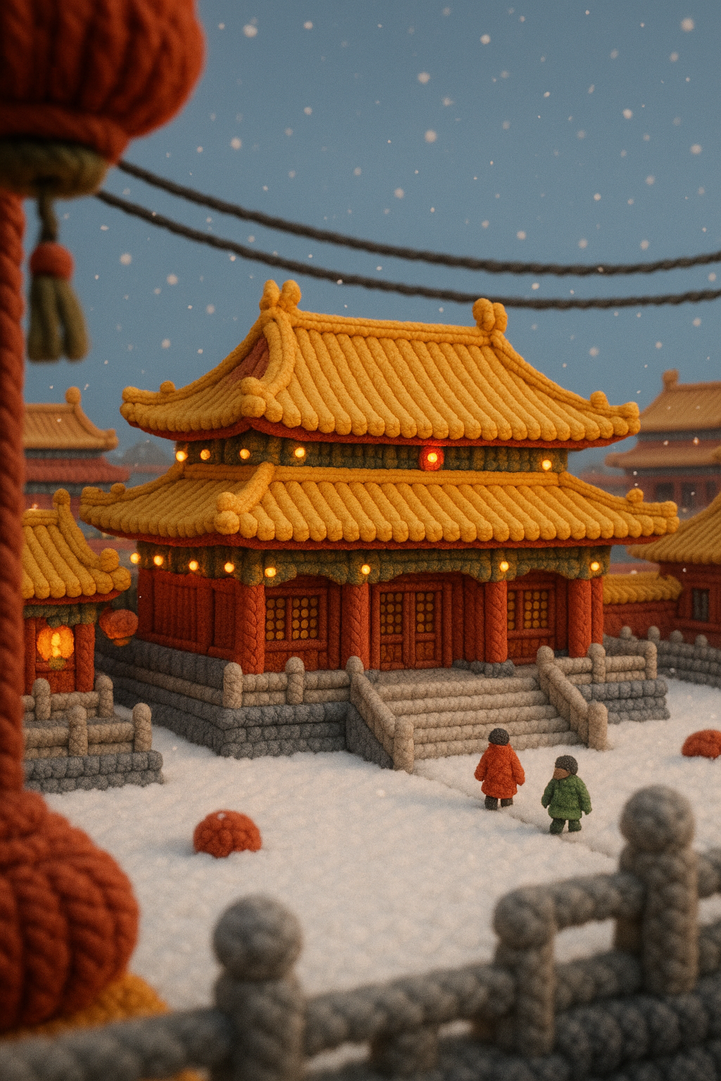 /Collection: /by davooda/Type: PNG/A charming 3D representation of a winter town featuring yarn-like buildings and structures, with snow gently falling. The scene includes small figures, warm lights, and a cozy holiday atmosphere.