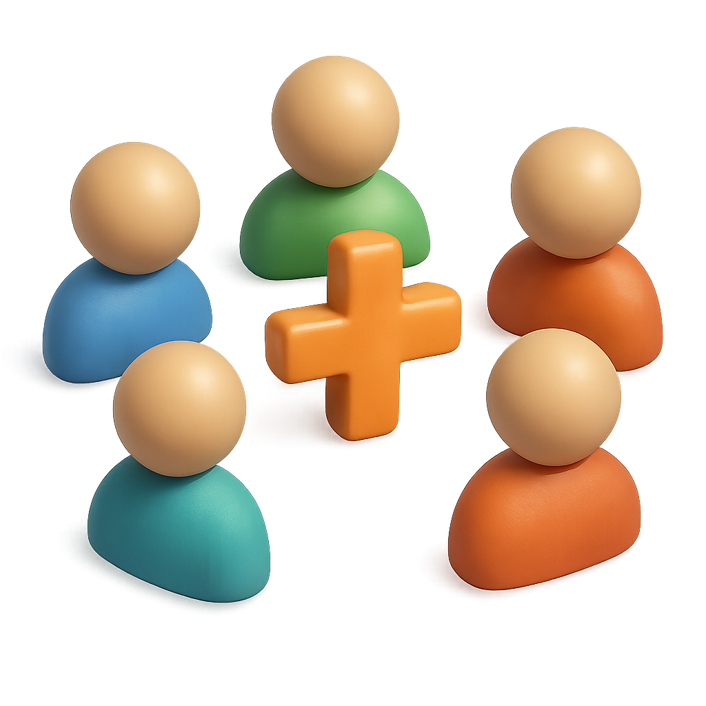 /Collection: /by davooda/Type: PNG/This image features a 3D representation of six stylized figures arranged in a circle, with a prominent orange plus sign at the center. The figures are in varying colors including blue, green, and orange, against a soft gradient background.