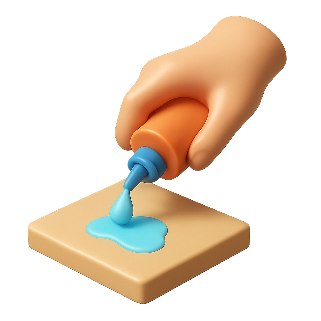 A 3D icon depicting a hand squeezing a bottle of blue liquid onto a beige surface, showcasing a glossy finish and volumetric depth.
