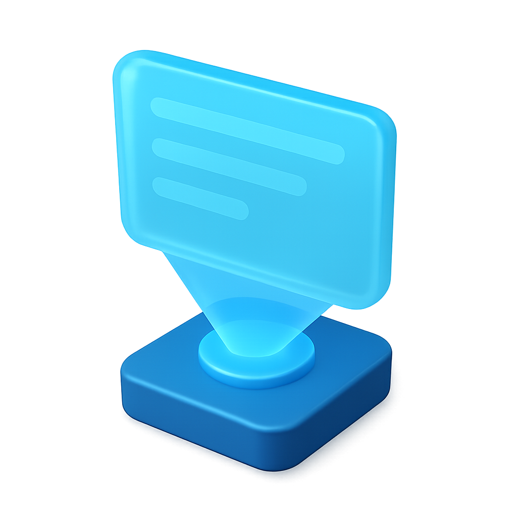 A 3D holographic display screen icon, featuring a blue transparent design with a volumetric effect. The icon is presented in a three-quarter isometric view against a subtle gradient background.