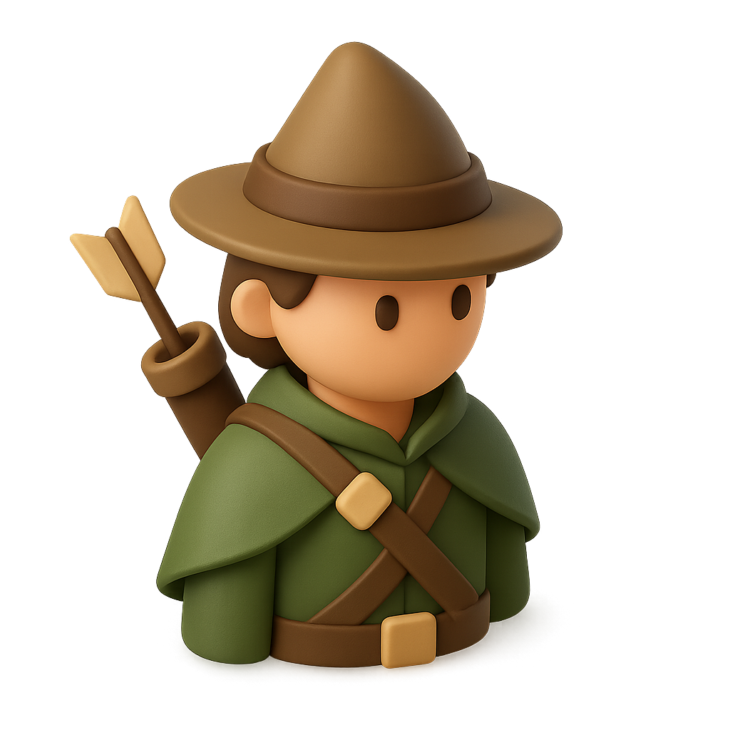 /Collection: /by davooda/Type: PNG/A stylized 3D icon of a ranger frontier scout depicted in a three-quarter view. The character wears a green cloak and a hat, with an arrow quiver on the side, set against a soft gradient background.