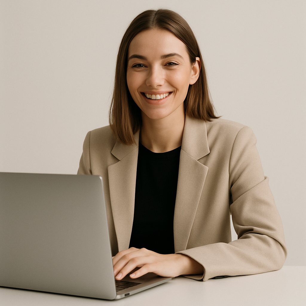 A smiling woman is seated at a table, looking directly at the camera while typing on a laptop. She is dressed in a stylish beige blazer, set against a minimalistic background.