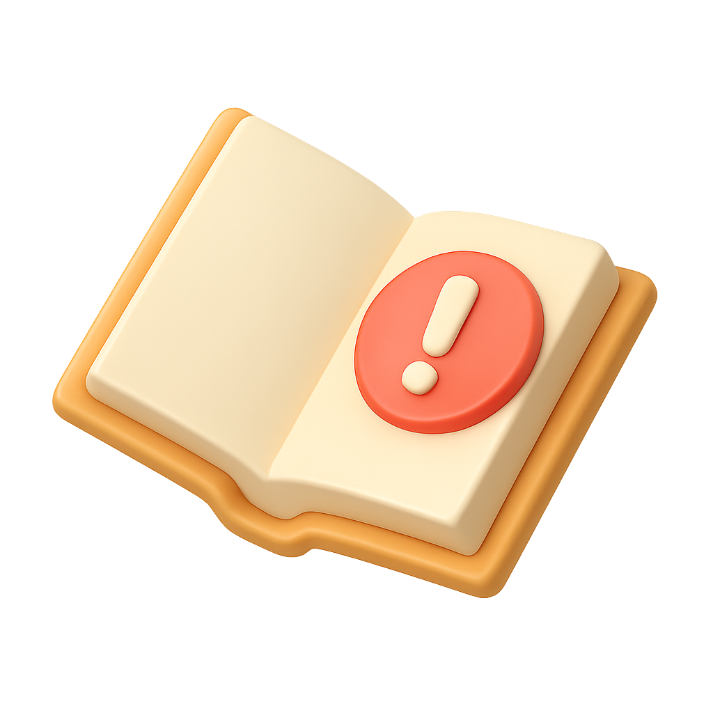 A 3D rendering of an open book featuring a prominent red exclamation mark on its cover. The design exhibits a glossy finish with a soft, warm background, creating a modern and playful aesthetic.