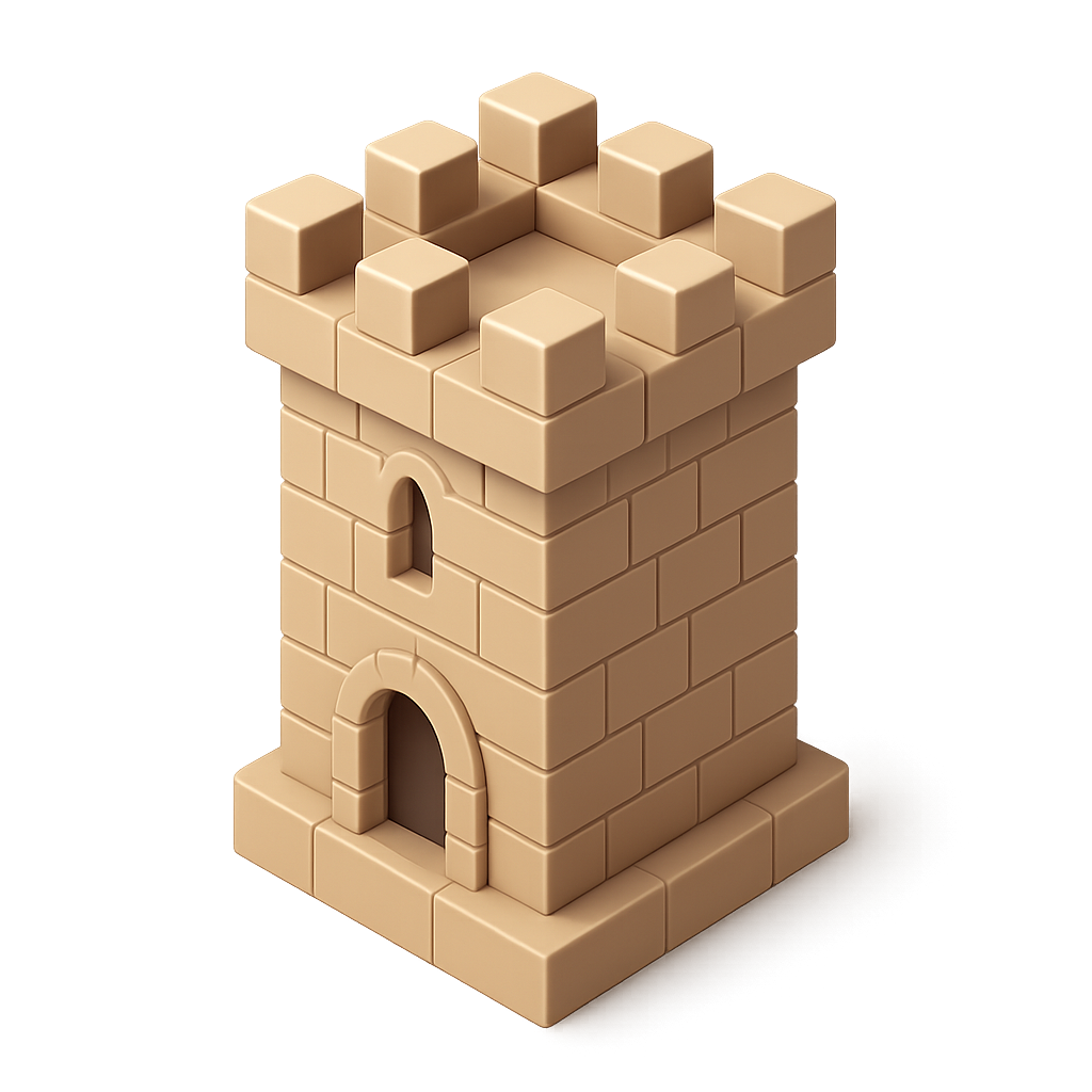 A stylized isometric tower icon featuring a keep design with a three-quarter view. The structure appears to be made of blocks, giving it a volumetric and 3D feel.