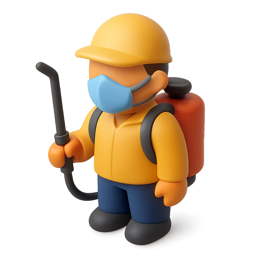 /Collection: /by davooda/Type: PNG/A stylized 3D icon of an exterminator wearing a yellow hat and mask, holding a sprayer. The character is designed in a three-quarter view with a vibrant, isometric look.