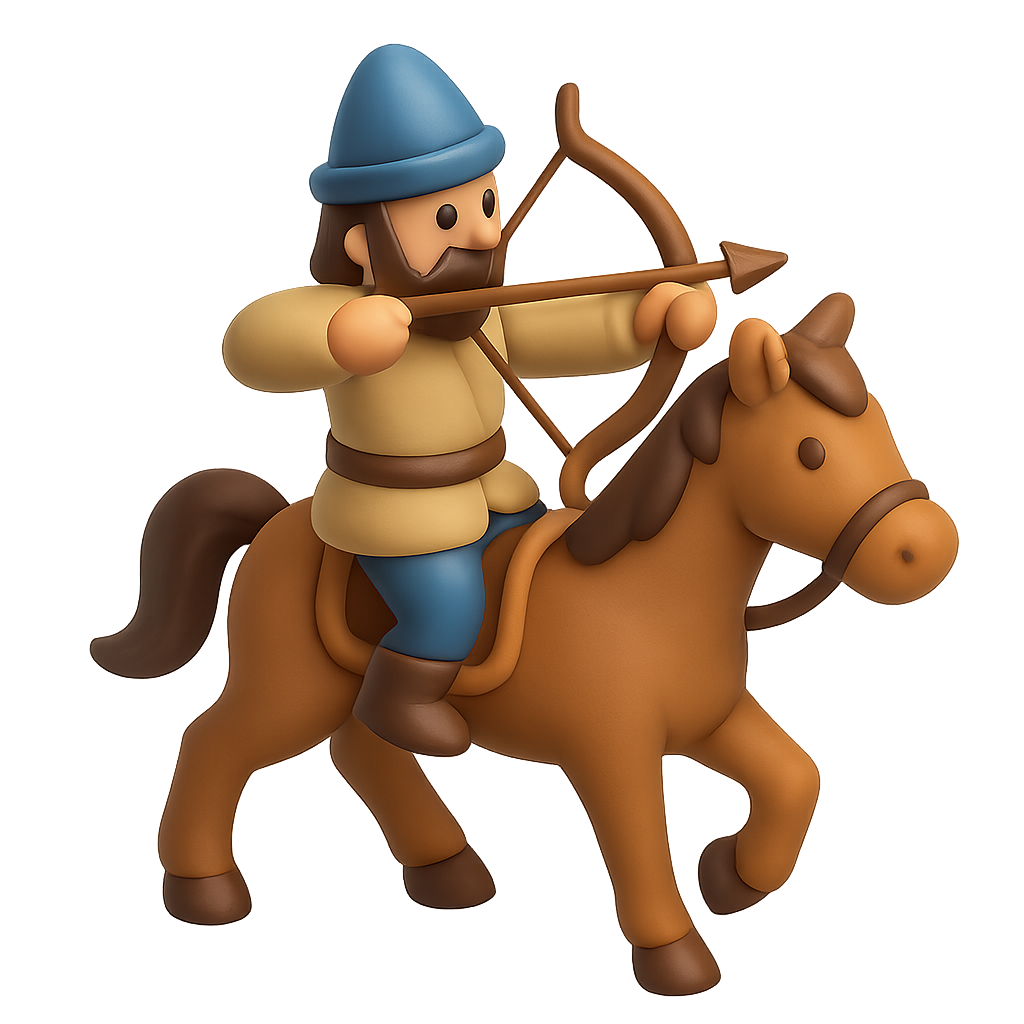 /Collection: /by davooda/Type: PNG/A stylized 3D icon depicting a Parthian horse archer in a three-quarter view. The archer, wearing a blue hat, holds a bow, riding a brown horse, against a soft gradient background.