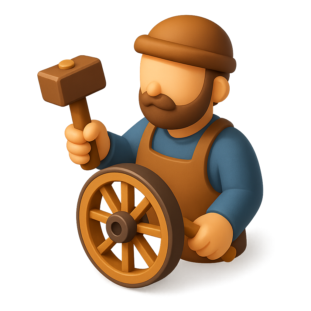 A stylized 3D icon of a wheelwright holding a hammer and a wheel, presented in a three-quarter view. The design features a soft color palette and a volumetric feel.