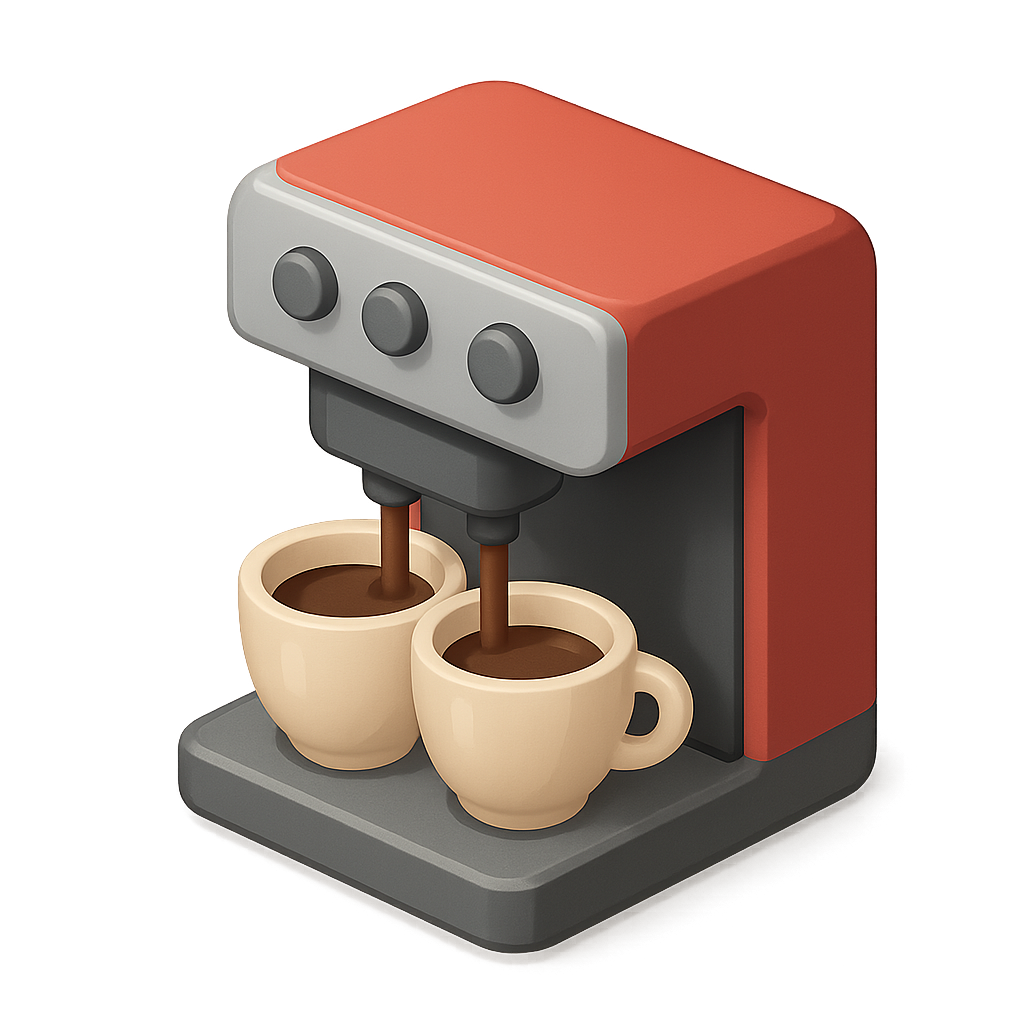 A modern 3D coffee machine in a three-quarter view, featuring two cups filled with coffee. The design showcases a red and gray color scheme, highlighting its sleek and isometric style.
