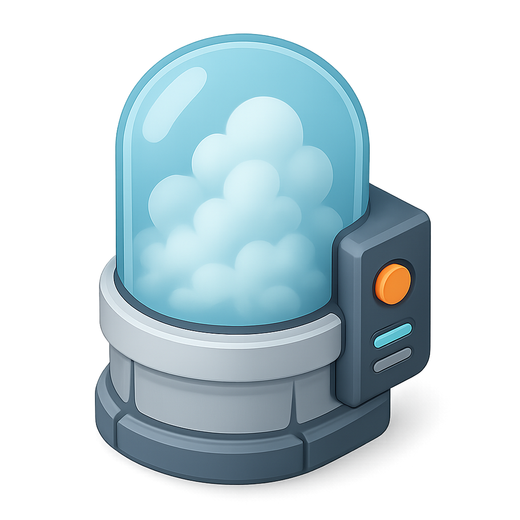 A visually appealing 3D icon of a cryogenic chamber, showcasing a transparent dome with vapor. The design features a sleek base and control panel, rendered in isometric view.