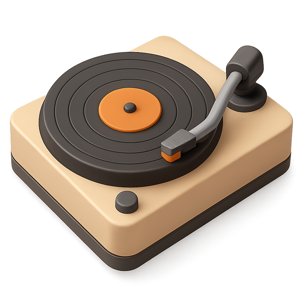 A modern 3D icon of a vinyl turntable, featuring a circular record and a distinct orange center. The design showcases a sleek, volumetric look with a transparent background.