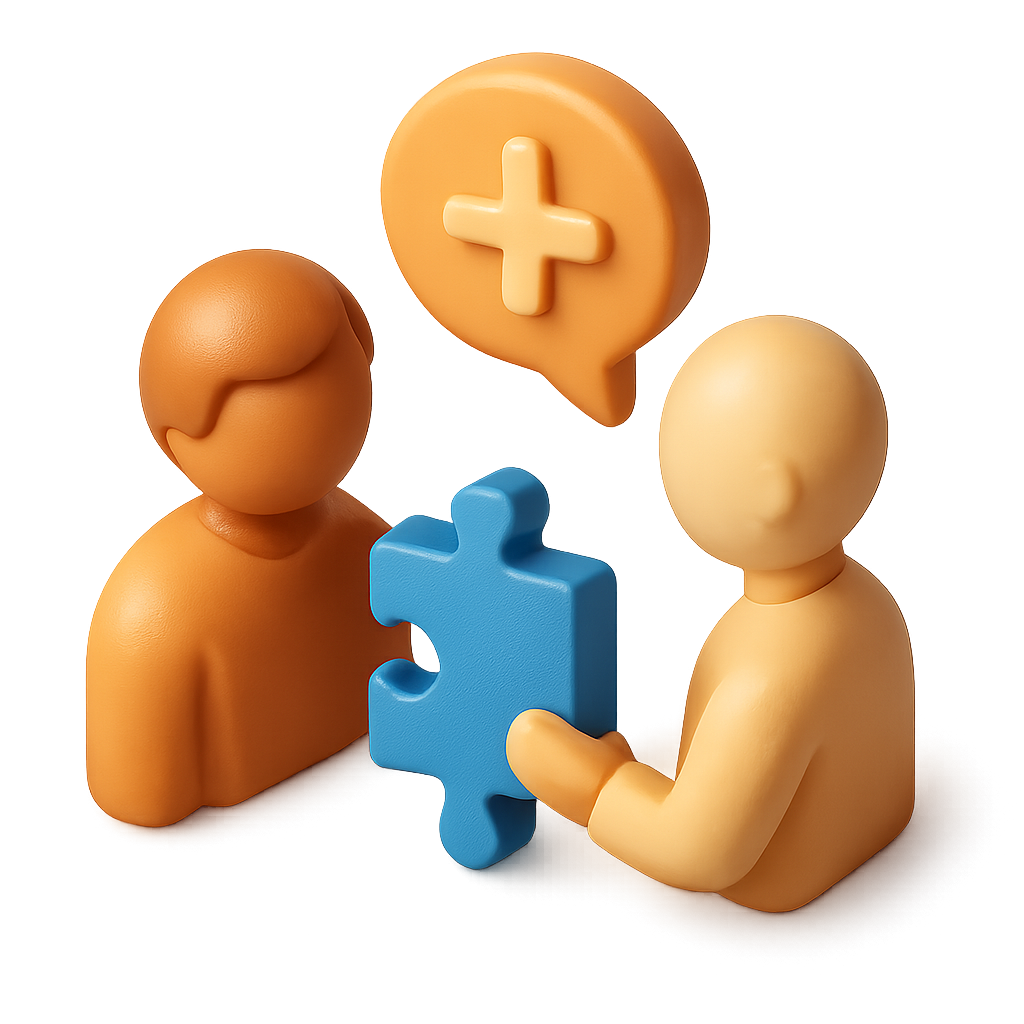 A vibrant 3D icon featuring two characters in conversation, exchanging a blue puzzle piece. The background is a warm gradient, enhancing the isometric design.