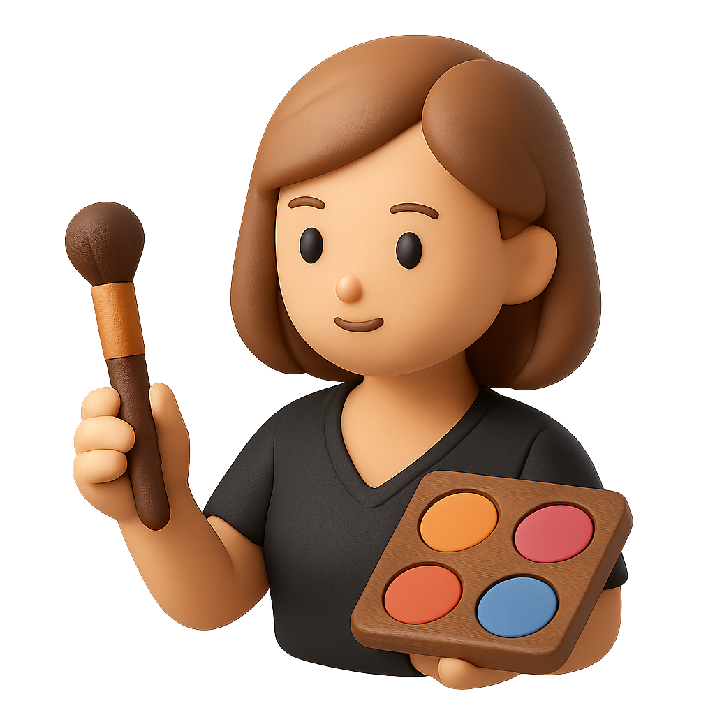 A stylized 3D icon of a makeup designer holding a brush and a palette with colorful shades. The character is presented in a three-quarter view with a soft, volumetric feel.