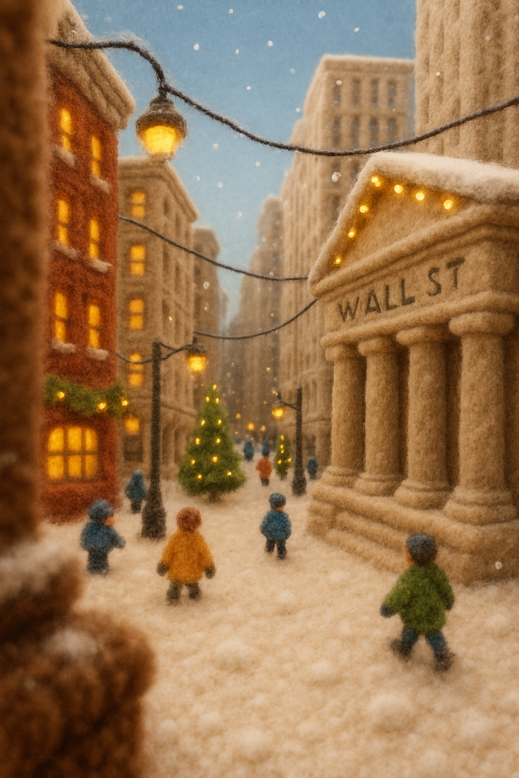 A whimsical 3D depiction of Wall Street in winter, crafted from yarn. The scene features a snowy street lined with buildings, a Christmas tree, and tiny figures enjoying the festive atmosphere.