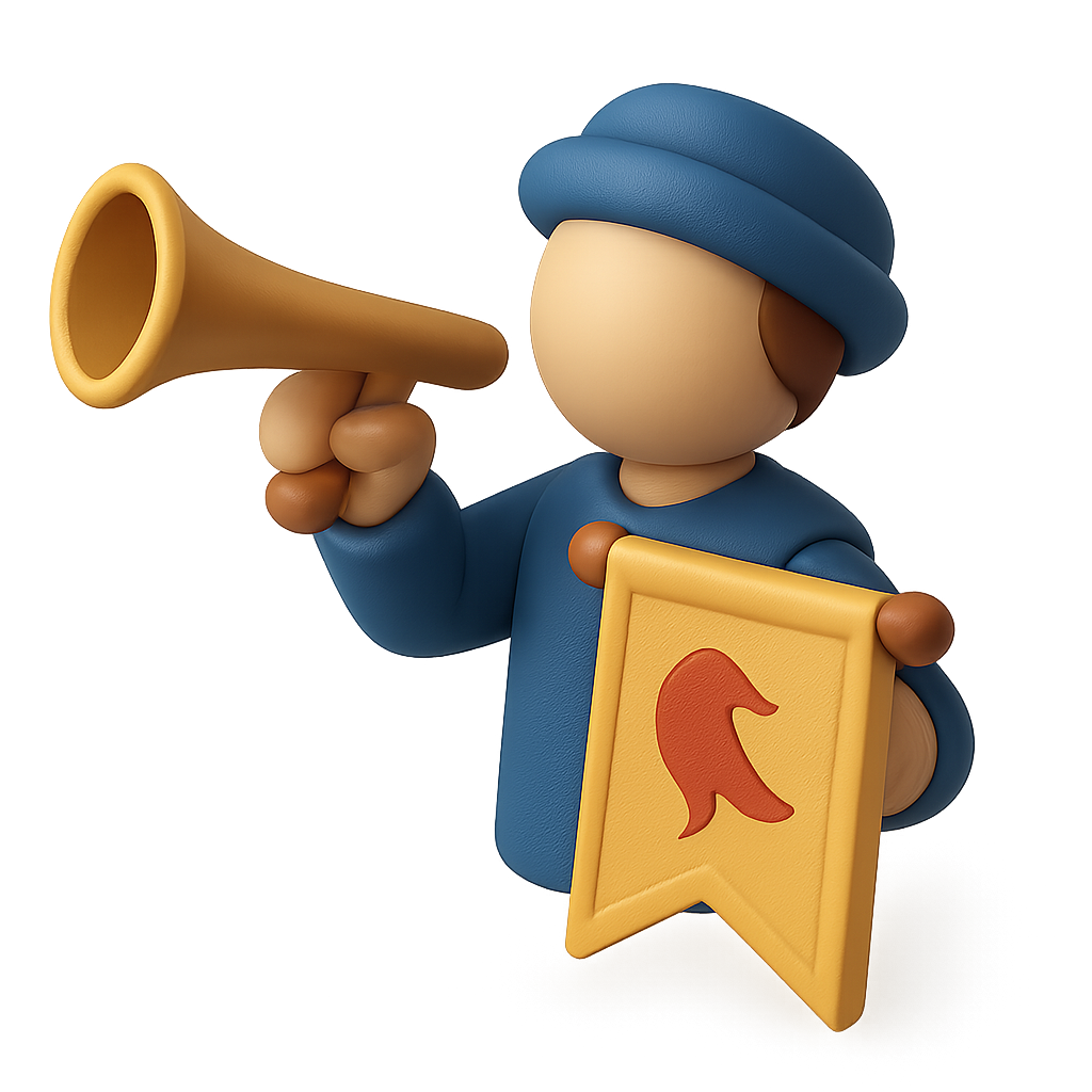 This 3D icon features a stylized herald announcer holding a trumpet in one hand and a banner in the other. The character is rendered in a simple, isometric style with a transparent background.