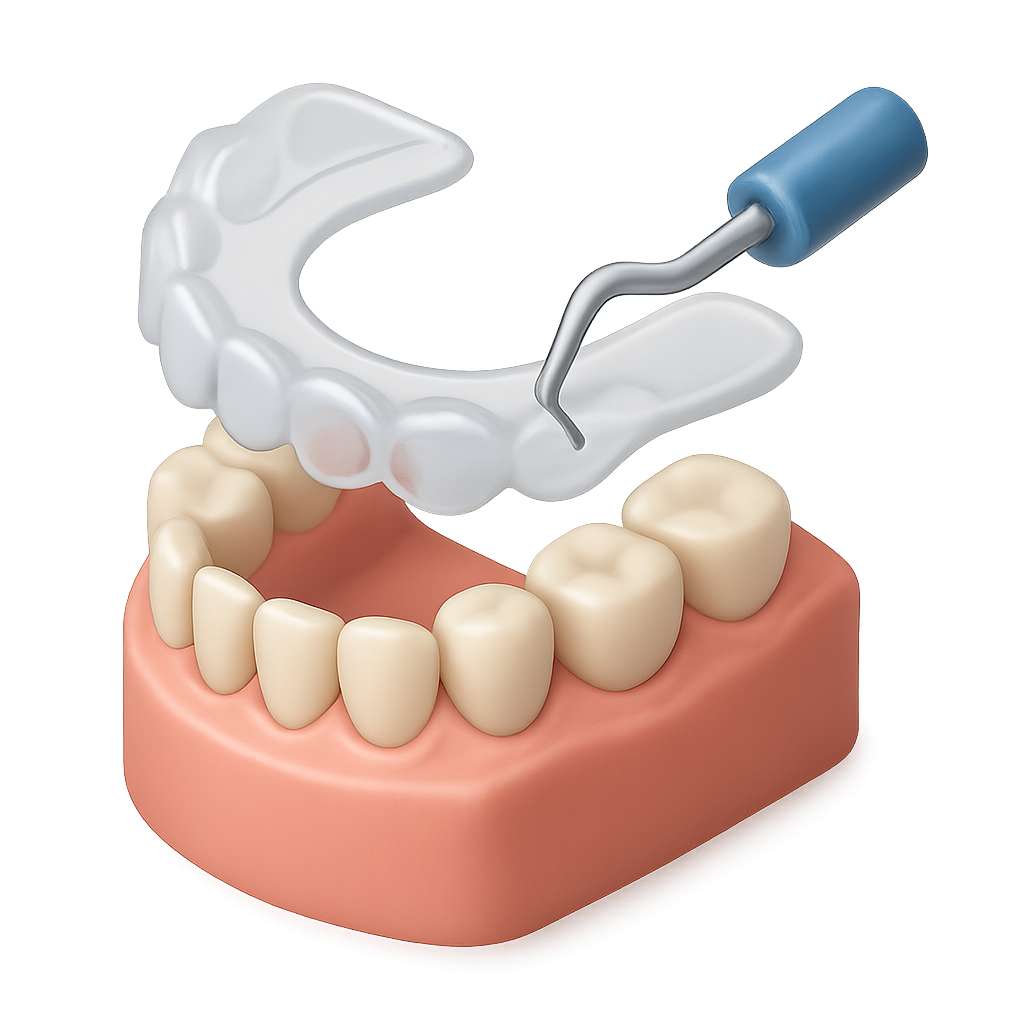 /Collection: /by davooda/Type: PNG/This image features a 3D representation of a dental retainer above a model of teeth, showcasing a three-quarter isometric view with a transparent background. A dental tool is also included.