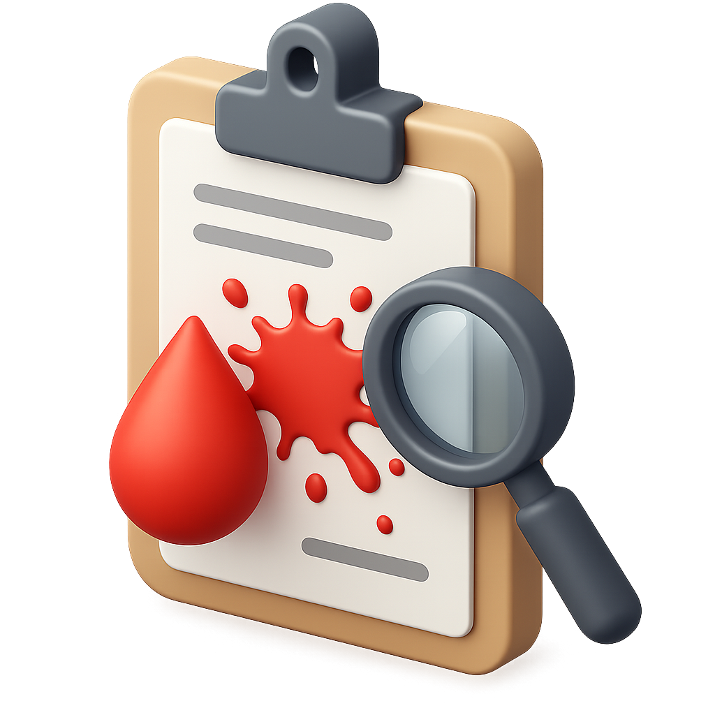 A 3D icon depicting a clipboard with a blood spatter and magnifying glass, designed with a transparent background and volumetric isometric style.