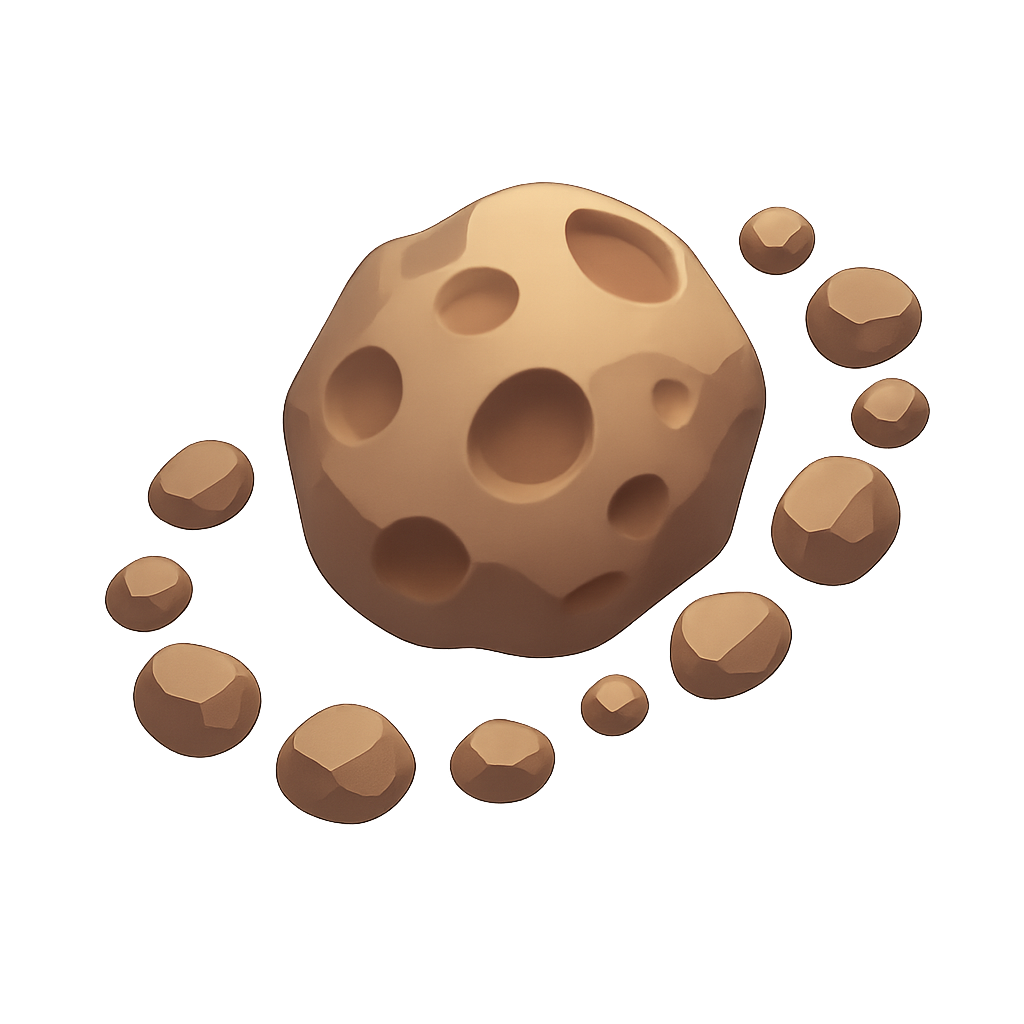 A visually striking 3D representation of an asteroid surrounded by smaller rocks, rendered in a three-quarter isometric view. The design features a smooth, volumetric texture with a warm color palette.