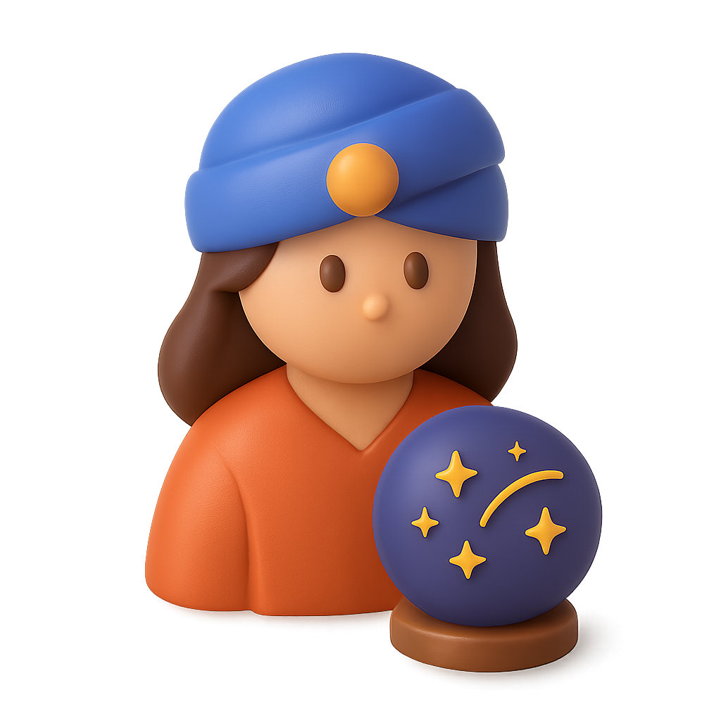 A whimsical 3D icon depicting an astrologer with a blue hat and an orange shirt. The character is shown with a star symbol on a round base, set against a dark background for a vibrant contrast.