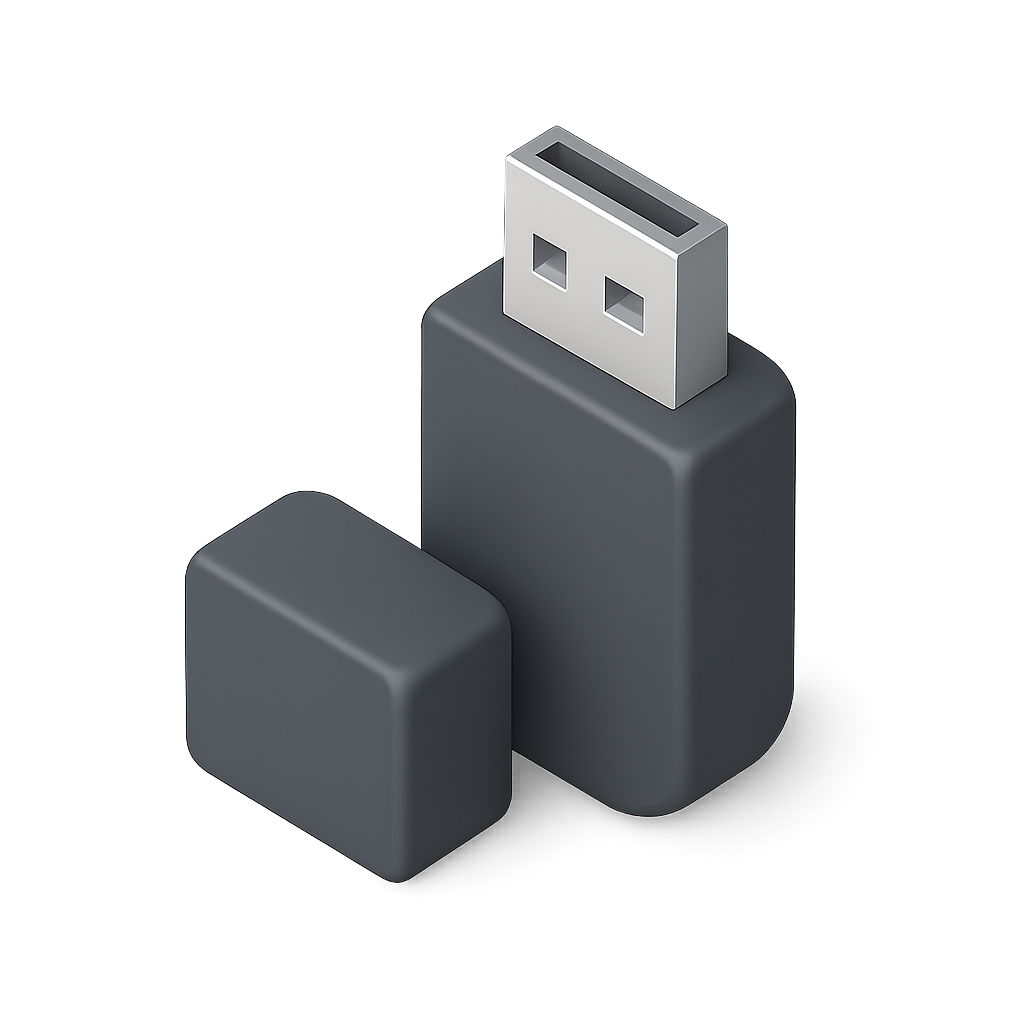 A sleek 3D icon of a memory stick with its cap, shown in a three-quarter view. The design features a modern, isometric style with a volumetric feel against a dark background.