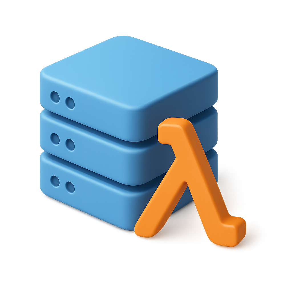 /Collection: /by davooda/Type: PNG/A visually striking 3D icon illustrating serverless computing, featuring stacked blue server blocks and a prominent orange lambda symbol, designed in a three-quarter isometric perspective.