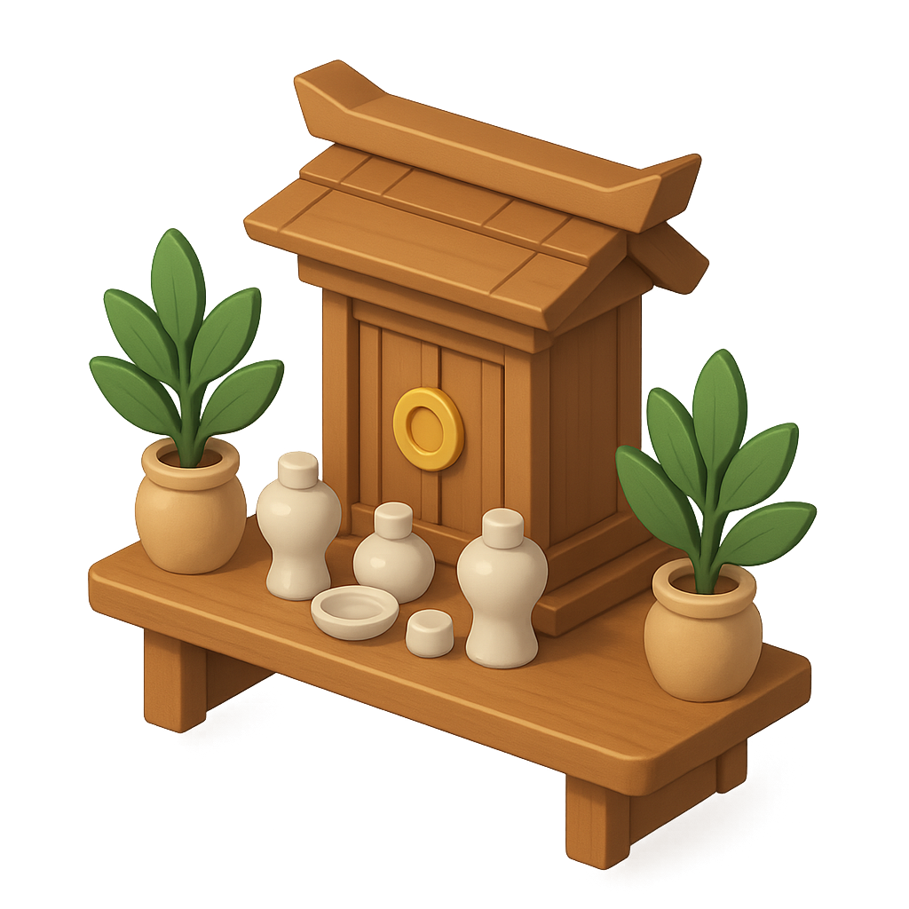 A stylized 3D icon of a kamidana home shrine featuring wooden structure, potted plants, and ceremonial offerings, displayed in a three-quarter view with an isometric design.