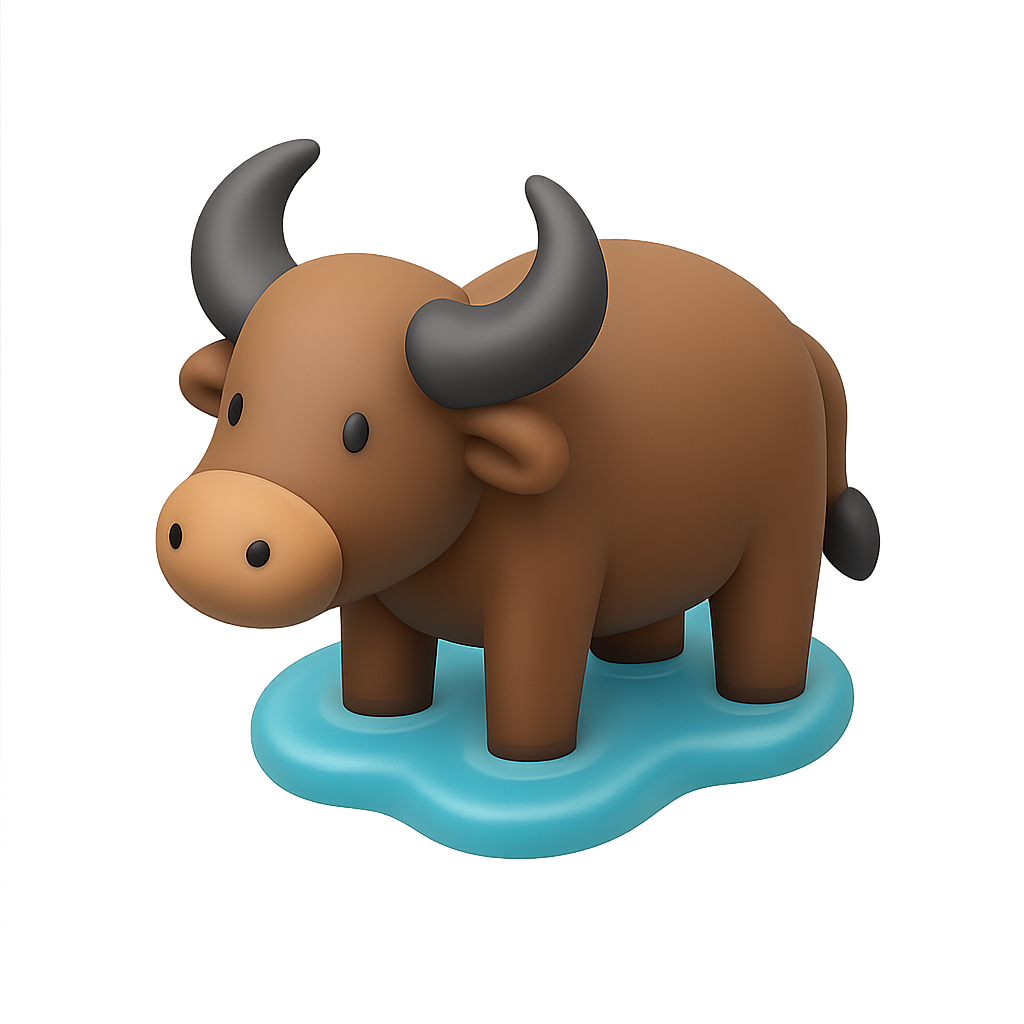 A stylized 3D icon of an Asian water buffalo, presented in a three-quarter view with a cute, cartoonish design. It features soft curves and a glossy finish, placed on a blue puddle.
