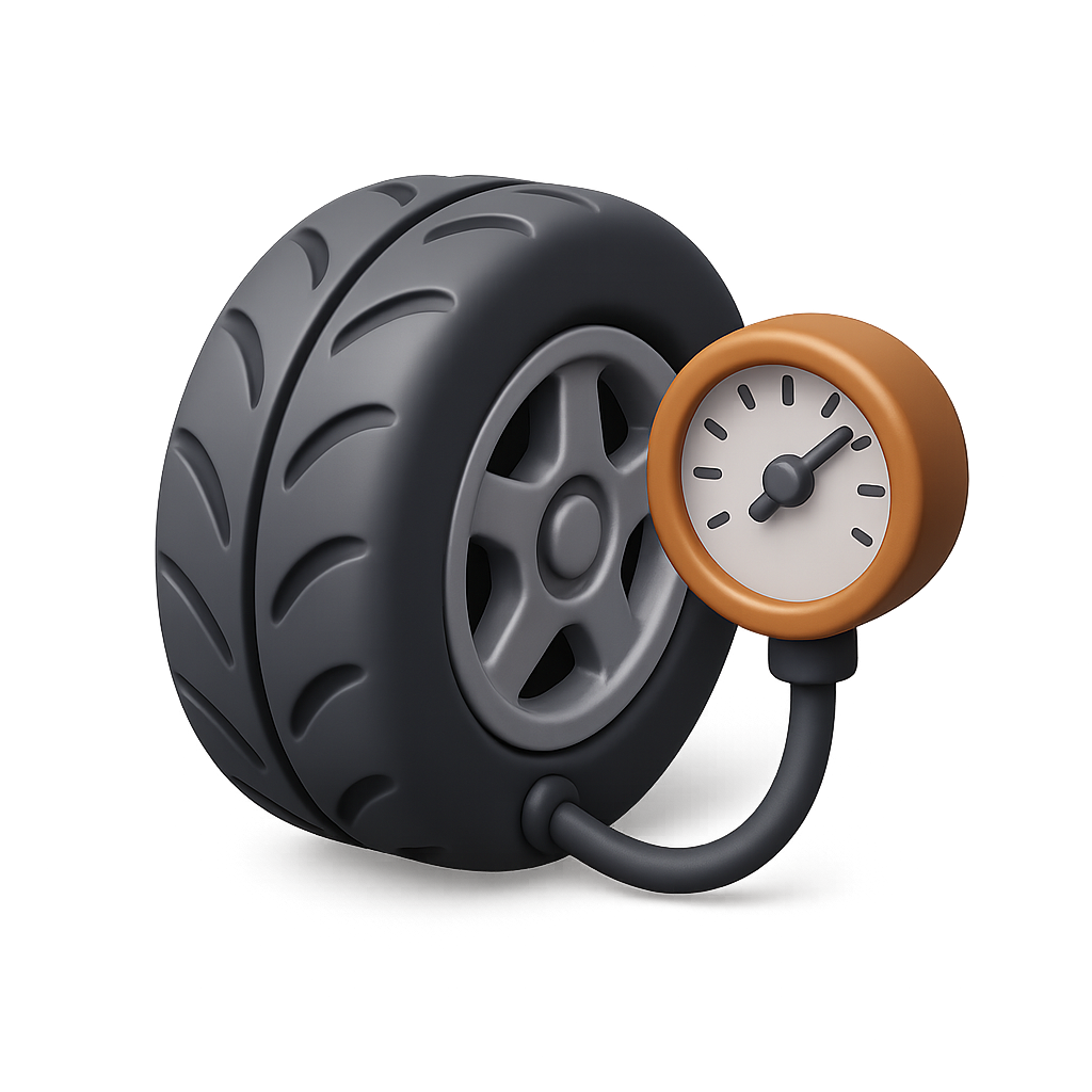 A detailed 3D icon of a tire featuring an air gauge. The design showcases the tire's tread and a round gauge with an orange casing, presented in a three-quarter isometric view.