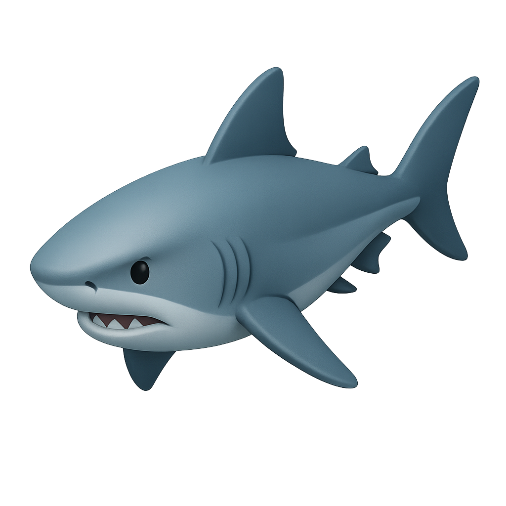 /Collection: /by davooda/Type: PNG/A stylized 3D bull shark icon depicted in a three-quarter view. The shark features a smooth, cartoonish design with a light blue color palette and an expressive face, set against a subtle dark background.