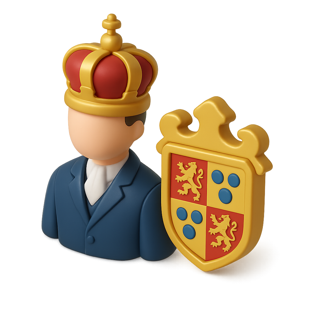 /Collection: /by davooda/Type: PNG/A stylized 3D icon of a marquess wearing a royal crown, alongside a coat of arms featuring a lion and blue dots. The design has a transparent background and a volumetric feel.