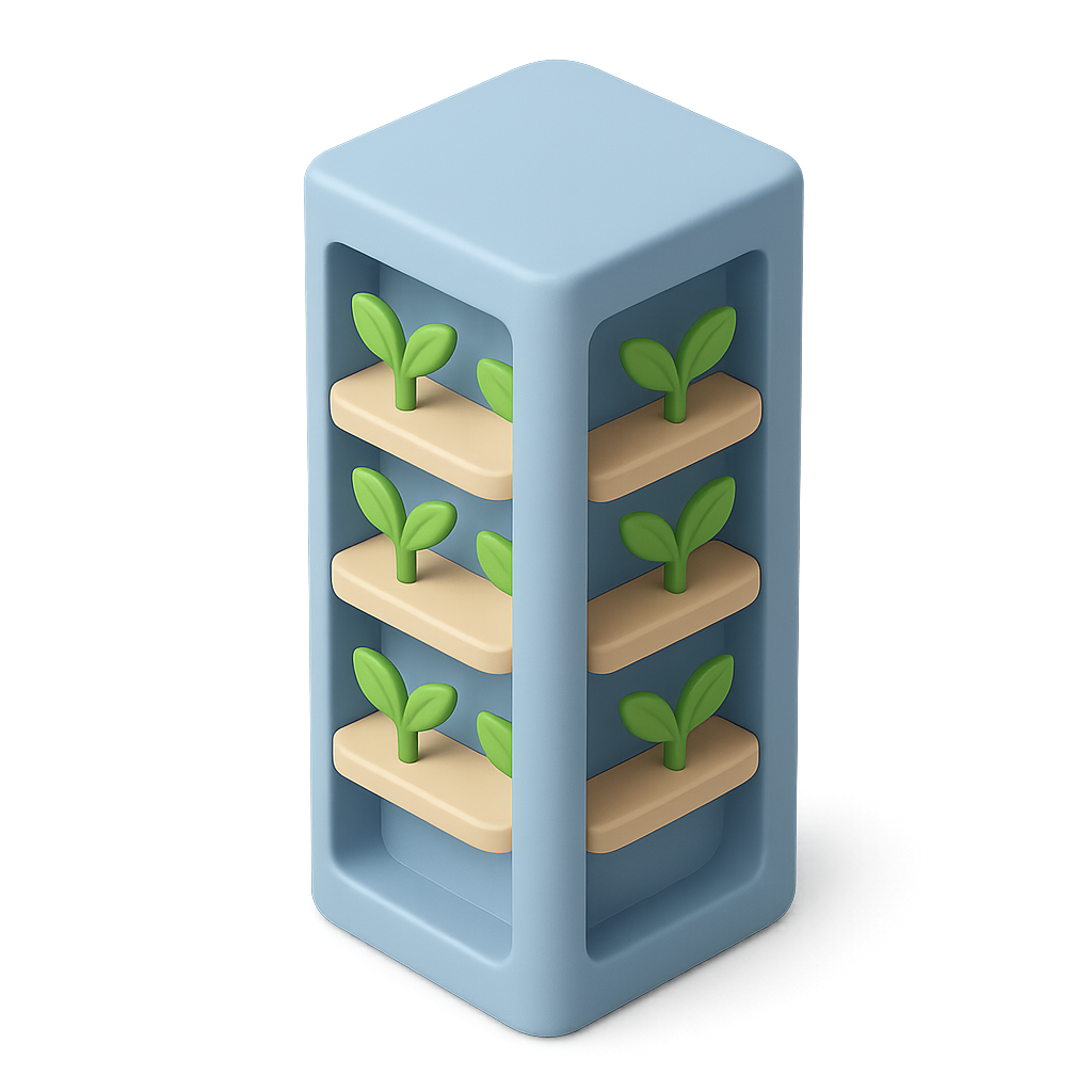 A stylized 3D icon of a vertical farming tower, featuring multiple layers with green plants growing in a blue structure. The design emphasizes a modern agricultural concept.