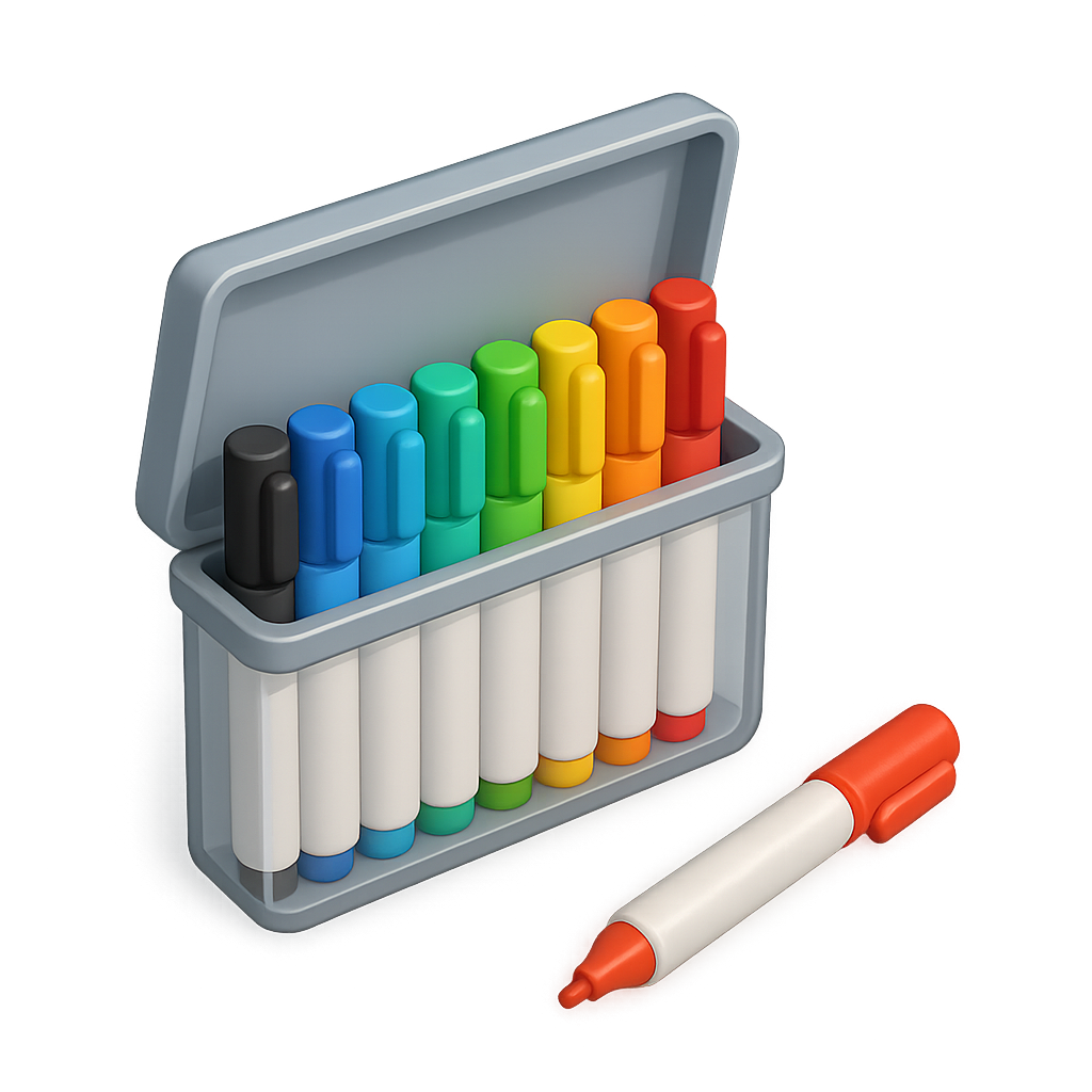 A vibrant 3D marker set displayed in a transparent case, featuring a variety of colors including black, green, blue, yellow, orange, and red. The design has a three-quarter view with a volumetric appearance.