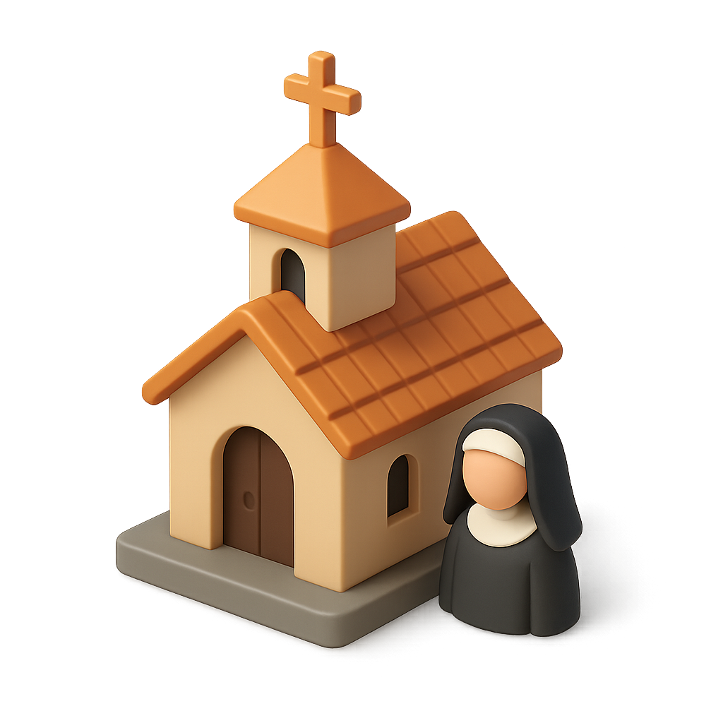 /Collection: /by davooda/Type: PNG/A stylized 3D icon depicting a convent with a nun. The structure features a cross on top and a textured roof, all rendered in an isometric view with a soft, glowing background.