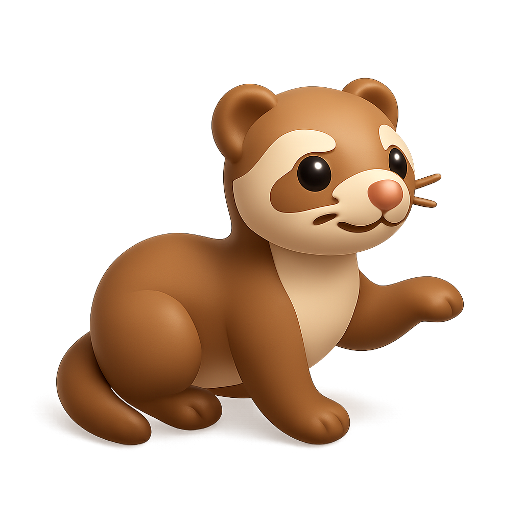 A charming 3D icon of a playful ferret in a three-quarter view, featuring a soft, rounded design with a transparent background. The ferret has a friendly expression and a smooth, volumetric finish.