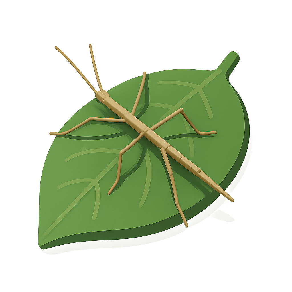 /Collection: /by davooda/Type: PNG/A stylized 3D icon of a stick insect camouflaged on a green leaf. The insect features a volumetric design and is presented in a three-quarter view against a soft, blurred background.