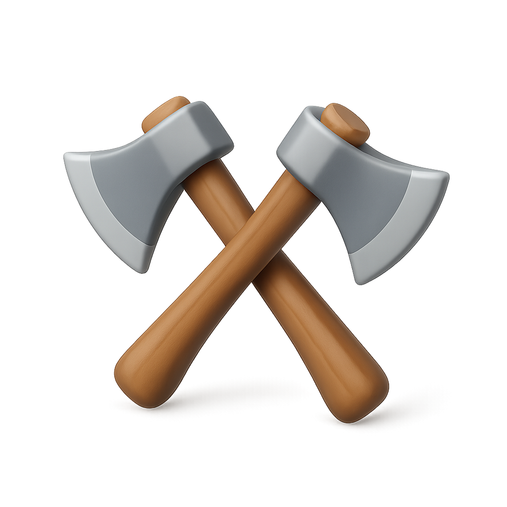 A stylized 3D icon featuring two crossed axes with metallic silver heads and wooden handles, presented in an isometric view against a blurred background.