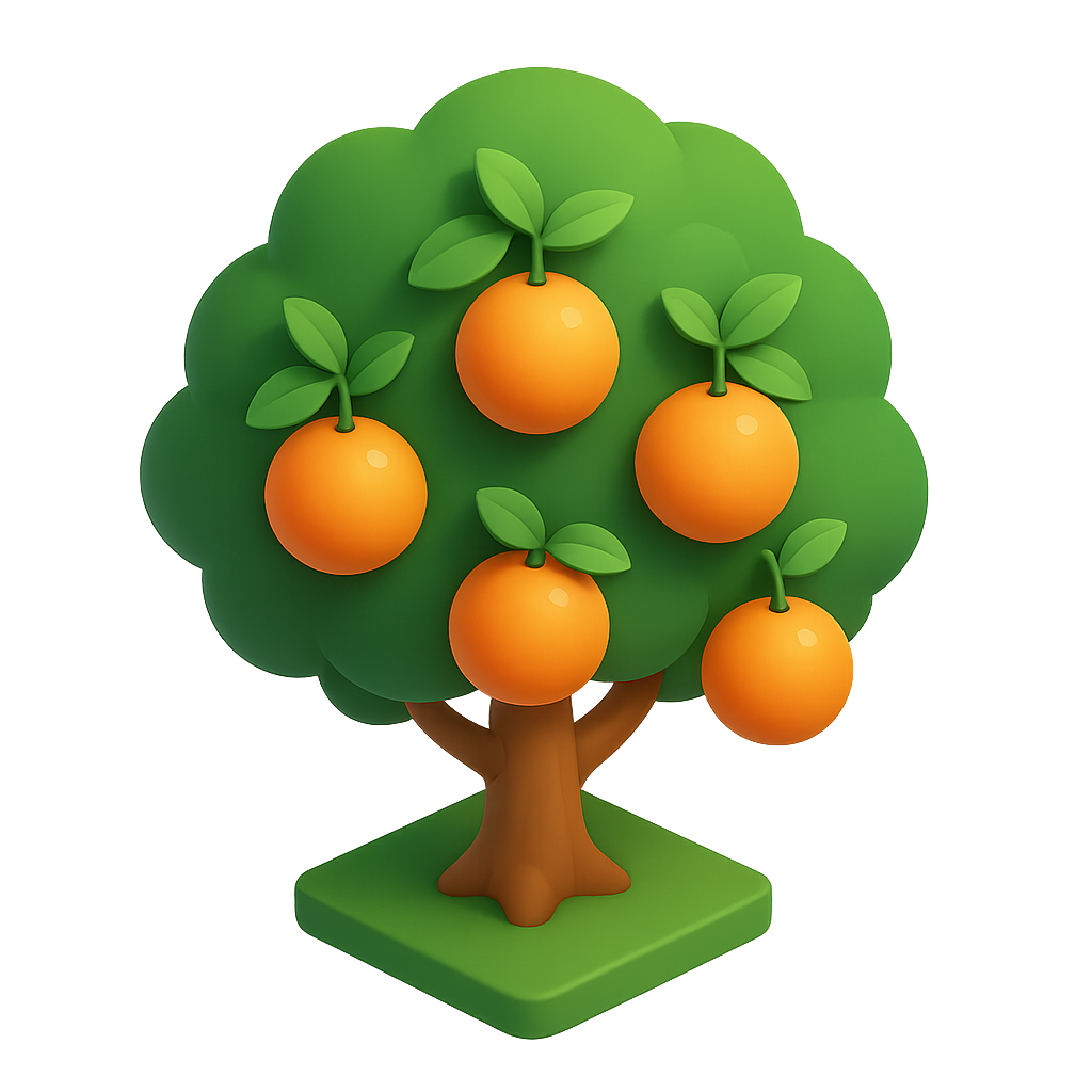A vibrant 3D icon of a citrus tree featuring lush green leaves and plump oranges, presented in an isometric perspective with a soft, volumetric feel.