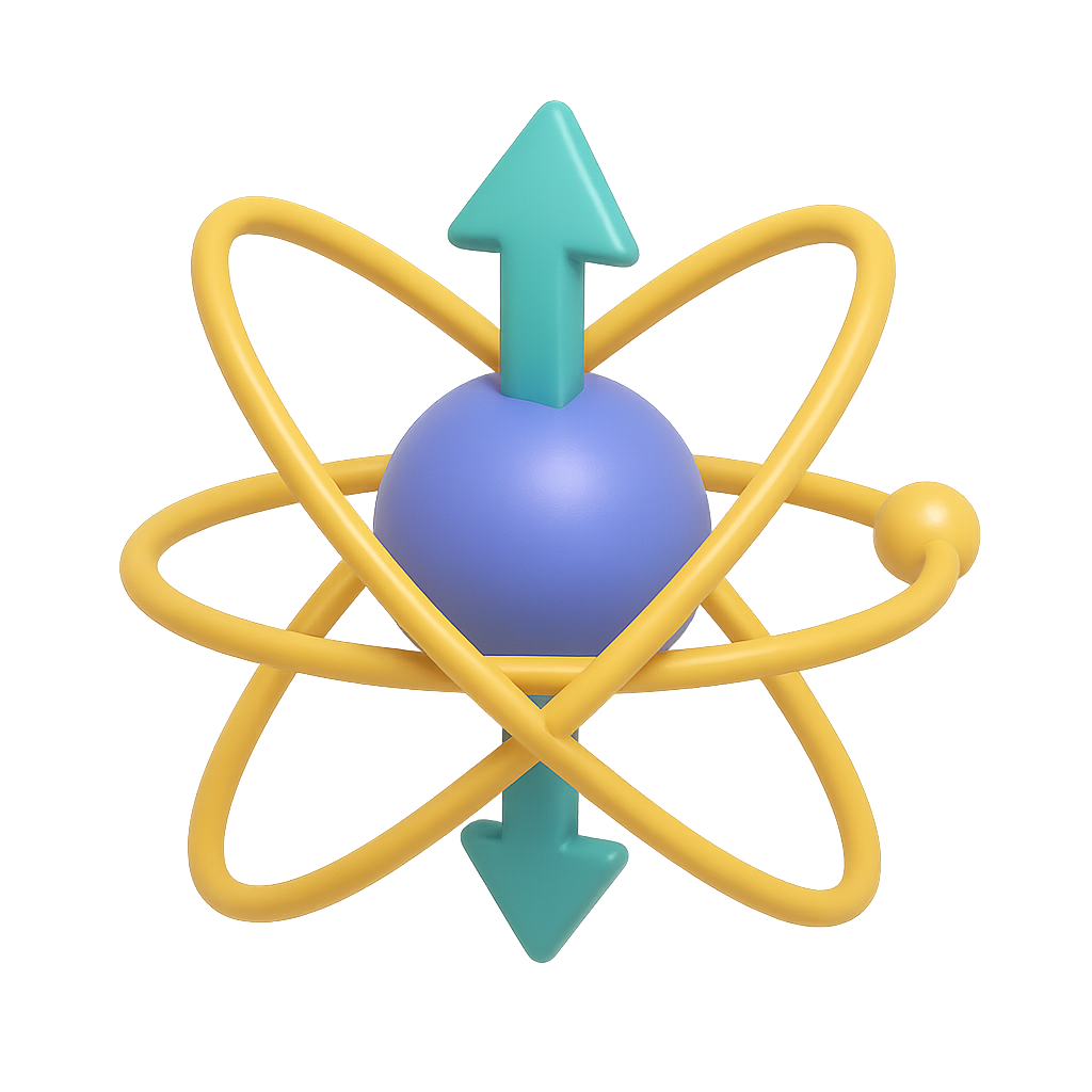 /Collection: /by davooda/Type: PNG/A visually striking 3D icon representing quantum superposition. It features a colorful atom with arrows indicating direction, set against a soft glowing background.