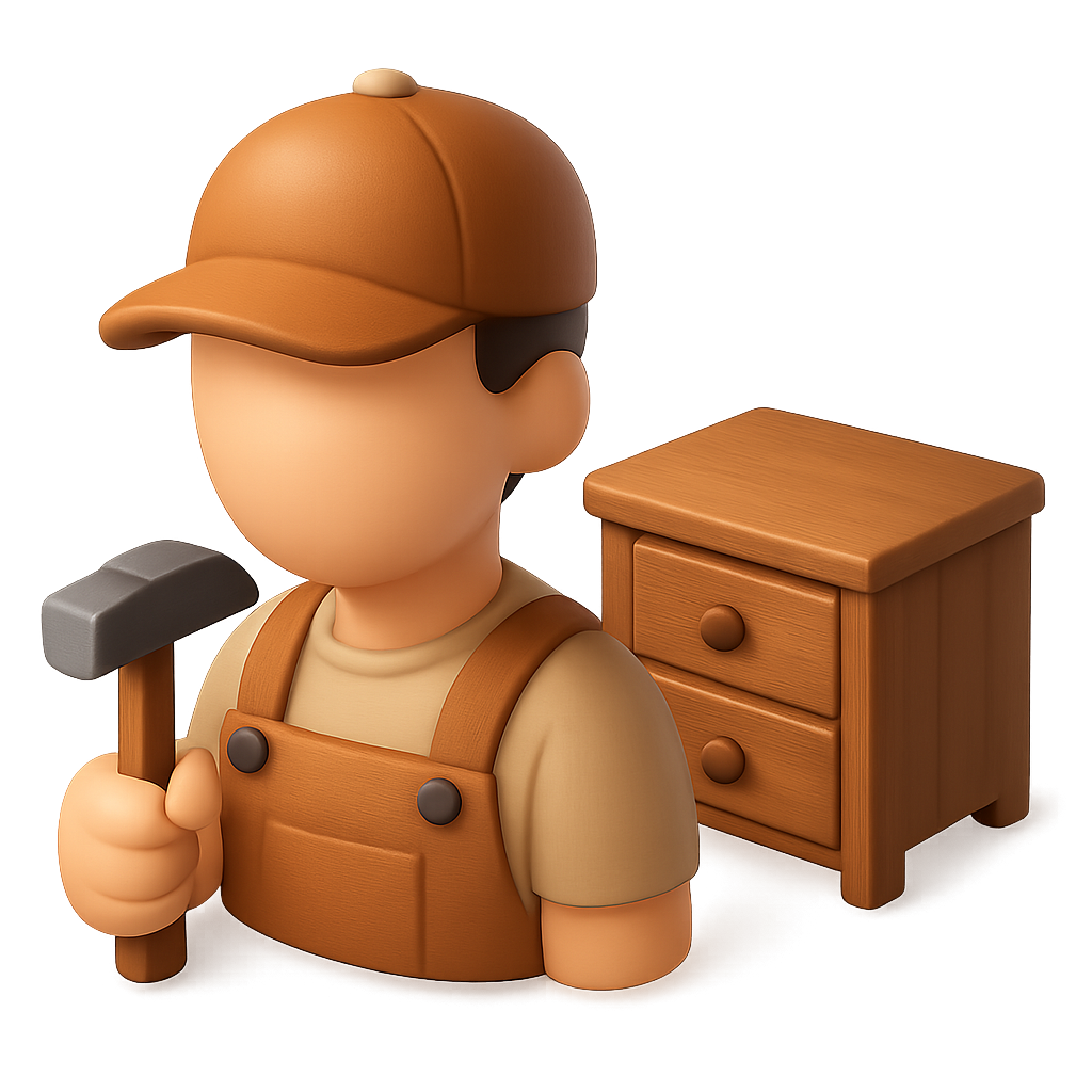 A stylized 3D icon of a cabinet maker holding a hammer, depicted in a three-quarter view. The character features a cap and overalls, with a wooden cabinet beside them, all against a soft gradient background.