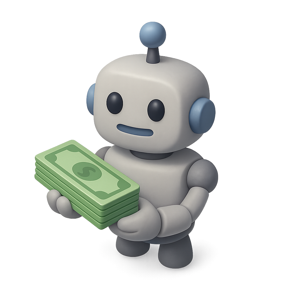 A stylized 3D robot character holds stacks of cash, depicted in a three-quarter isometric view with a soft gradient background. The robot features a friendly face and rounded design.