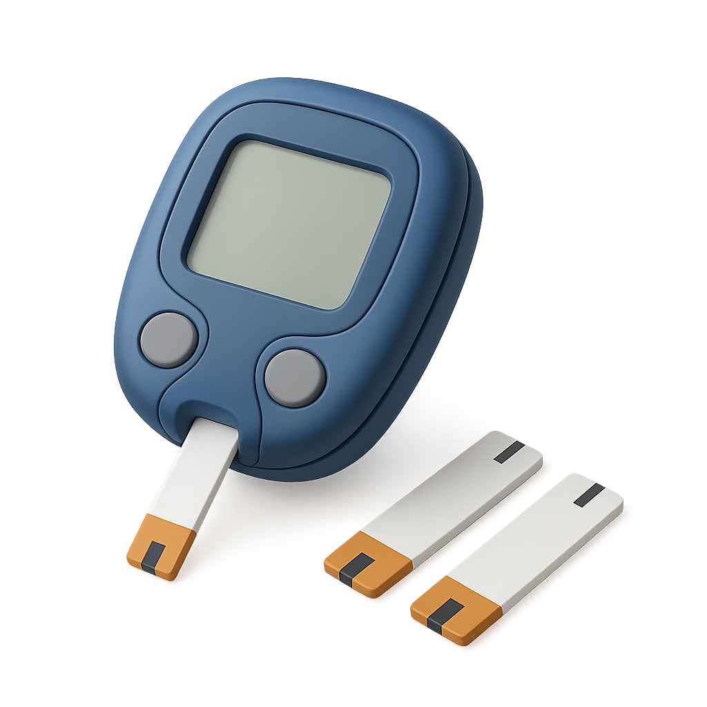 /Collection: /by davooda/Type: PNG/A 3D icon of a glucose meter featuring a sleek design, displayed in a three-quarter view with test strips. The icon has a transparent background, emphasizing its volumetric appearance.