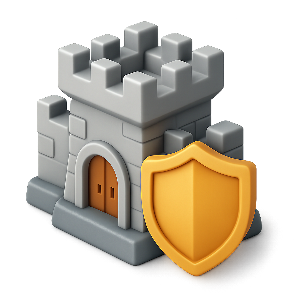 A stylized 3D representation of a fortress with a protective shield, showcasing an isometric view. The fortress features a solid structure with battlements, while the shield adds a layer of defense symbolism.